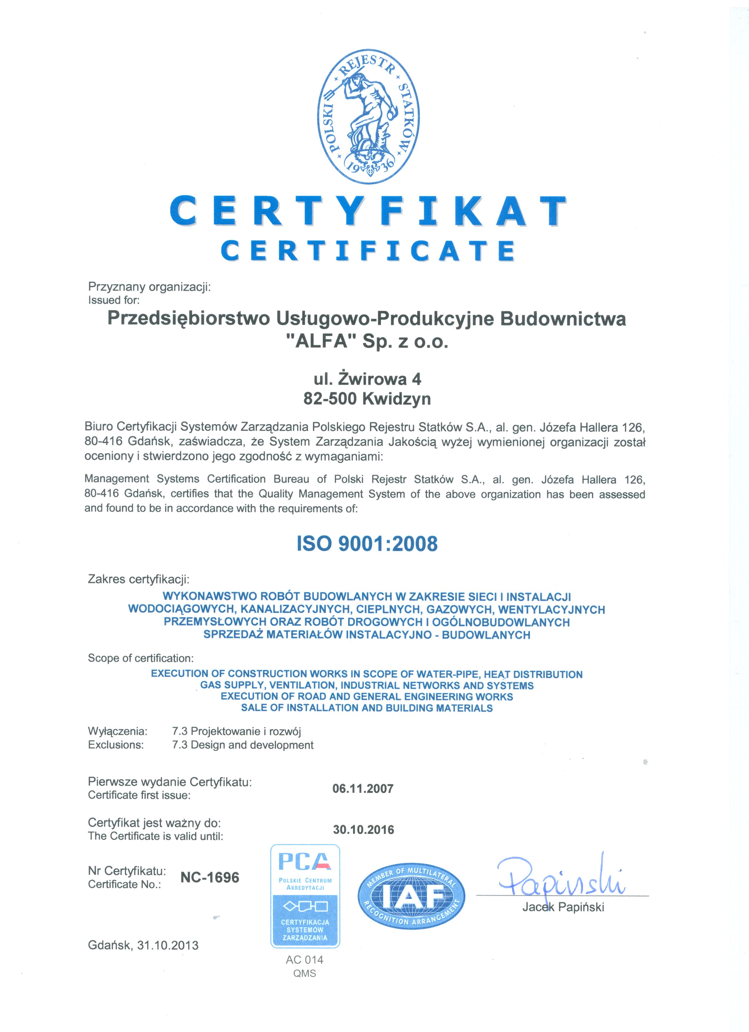 Od 19 listopada 2004 firma posiada certyfikat wydany przez RWTUV Polska o nr AC090/320/1358/2004 zaświadczający, że P.U.P.B. ALFA spółka z o.o. wprowadziła system zarządzania jakością wg normy PN-EN ISO 9001-2001. Wdrożony system jest zgodny z wymaganiami normy ISO 9001:2008, w zakresie: